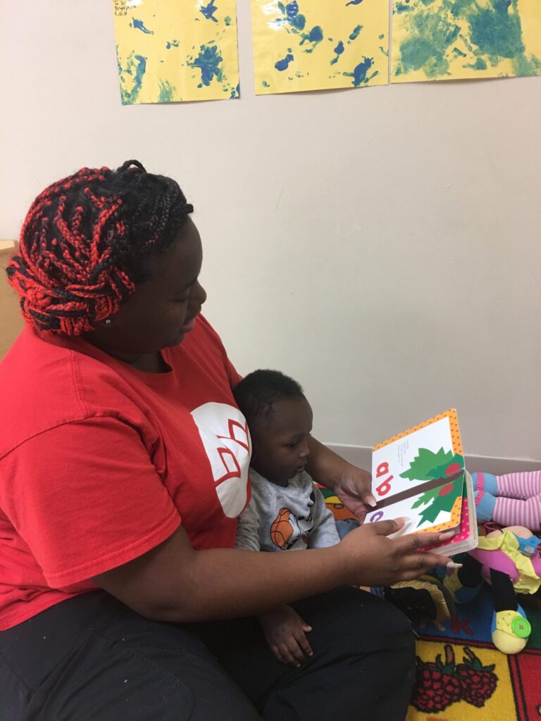 Destanie at her childcare job, reading to her young son.
