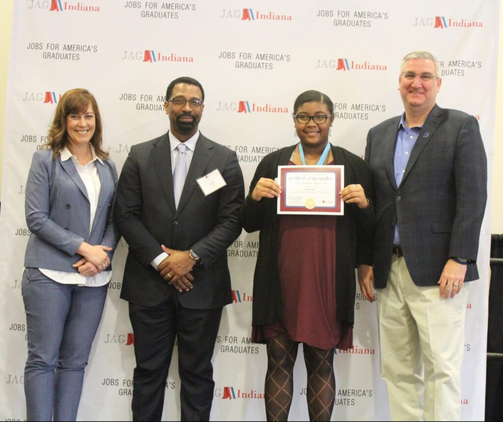 Jailah with DWD Commissioner Payne, and Governor Holcomb
